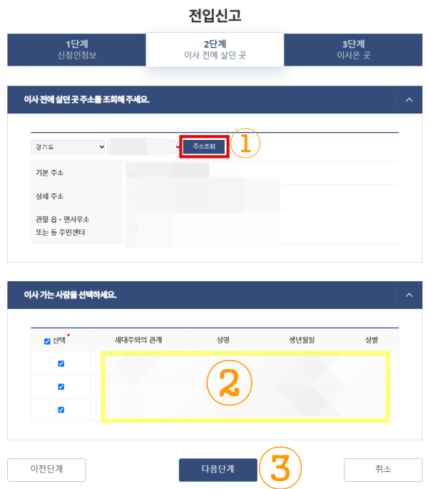 세대원 중 이사가는 사람을 선택한 후 다음단계를 클릭합니다.