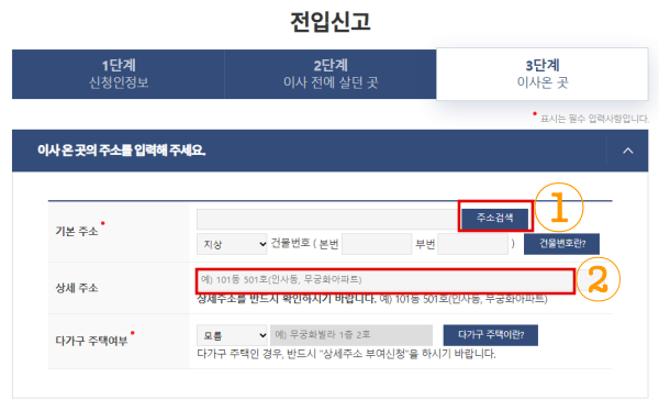 이후 동 호수와 같은 상세주소를 꼭 입력해야 하며, 다세대나 다가구로 이사하는 경우 다가구 주택여부를 확인하여 입력합니다.