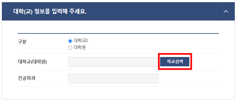 졸업한 대학교나 대학원을 선택한 후 학교검색을 눌러 대학교를 검색하고 졸업한 과를 적습니다.