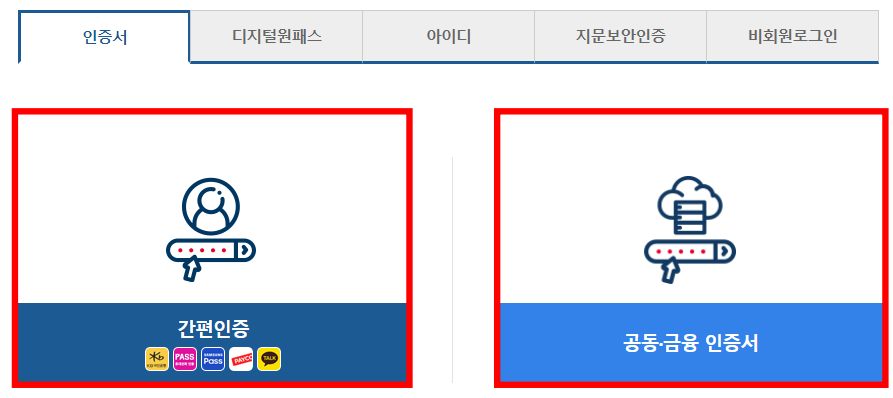 로그인은 인증서로 가능하며 페이코,카카오톡,삼성패스와 같은 간편 인증 또는 공인인증서와 같은 공동 인증서로 로그인이 가능합니다.