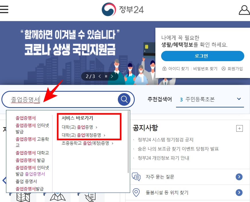 졸업증명서를 검색하면 대학교 졸업뿐 아니라 초중고 졸업증명서도 발급 가능합니다.