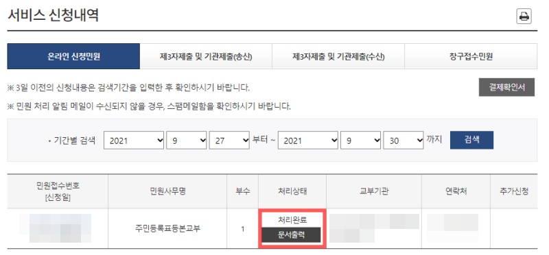 주민등록등본 인터넷발급 민원 신청하기를 누르면 대략 1분 이내로 민원이 처리 완료되며 처리상태에서 문서 출력을 누르면 인쇄가 가능합니다.