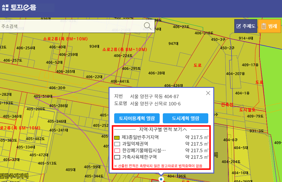 지역지구별 면적 보기를 클릭하면 해당 주소에 대한 정보가 나옵니다.