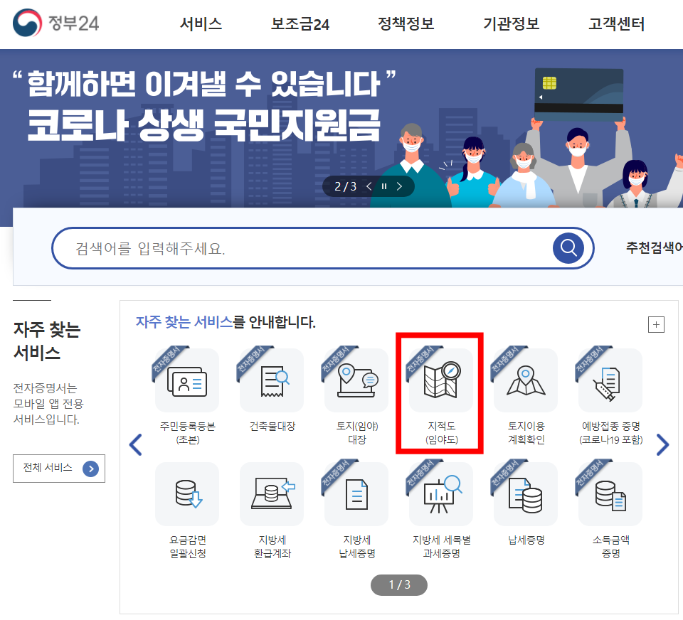 2. 정부24 사이트 메인 화면 중간 자주 찾는 서비스에서 지적도(임야도)를 클릭합니다.