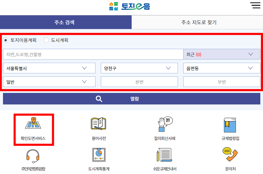 2. 토지이음사이트에서 주소 검색과 확인 도면서비스 중 하나를 택하여 검색합니다.
