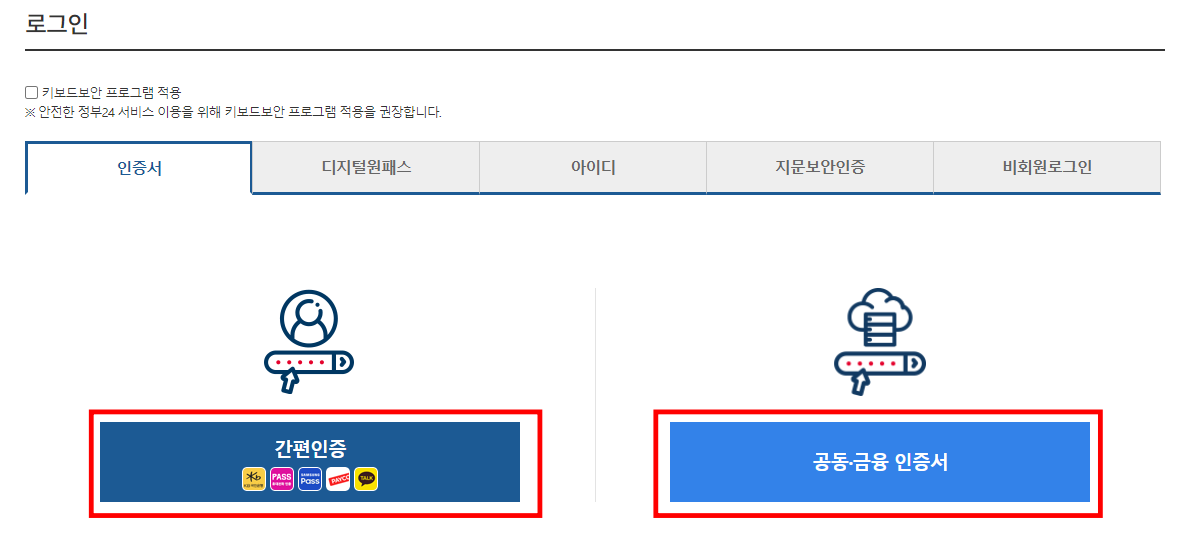 로그인은 공인인증서와 같은 공동인증서와 카카오톡, 삼성 패스와 같은 간편 인증으로 쉽게 로그인이 가능합니다.