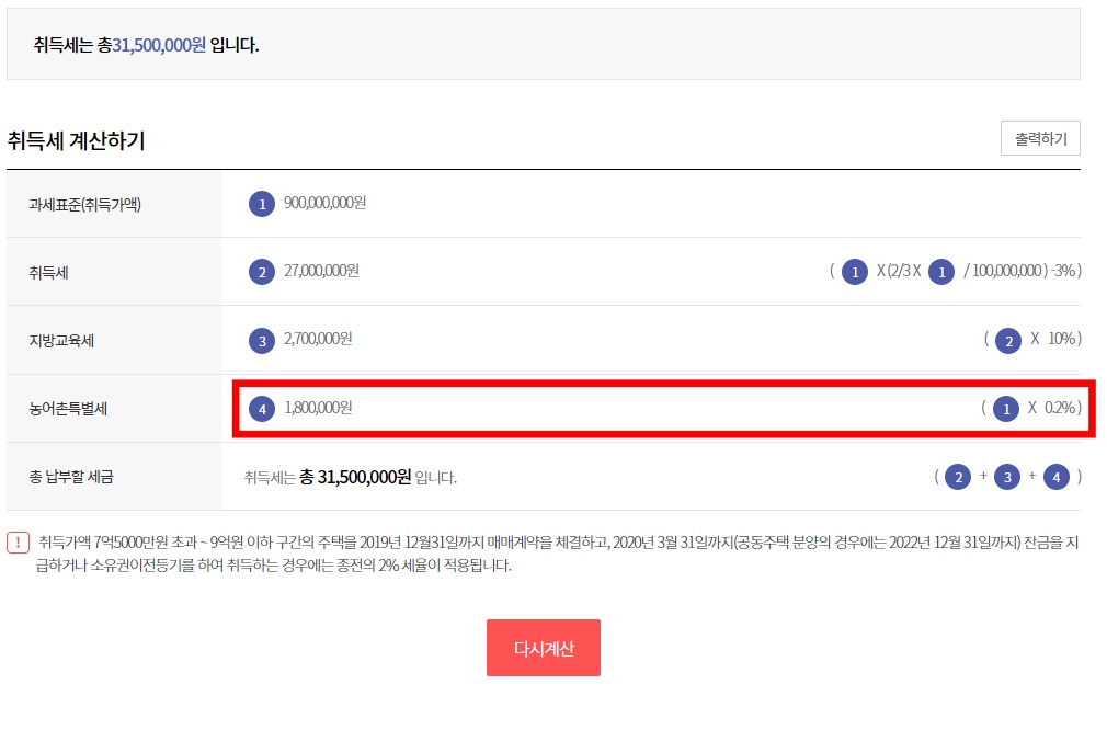 만약 전용면적이 85m2 를 초과한다면, 농어촌특별세가 과세되어 3150만 원이 나오게 됩니다.