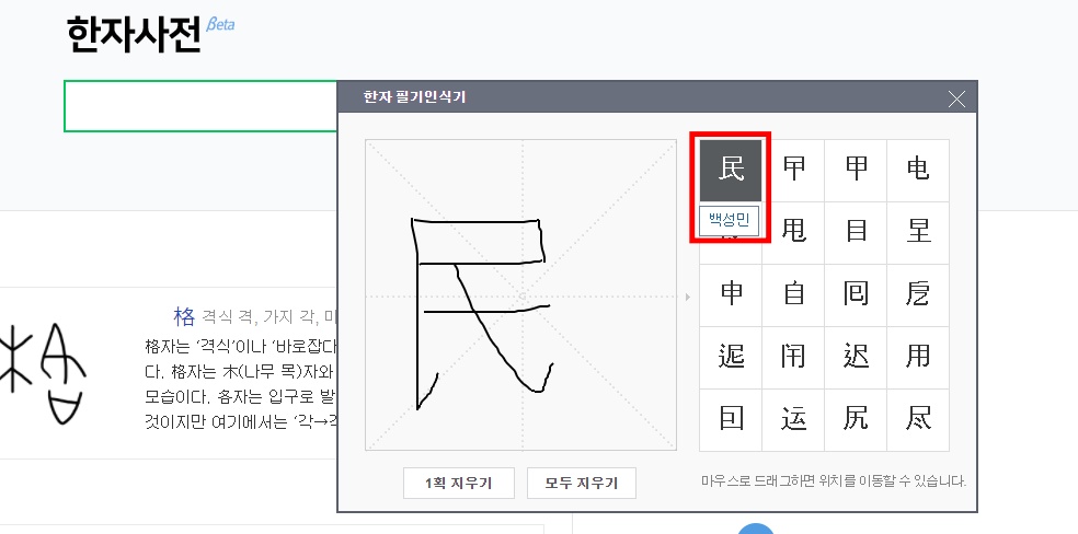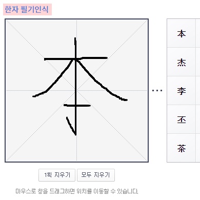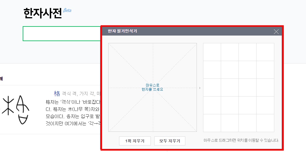 팝업으로 생성된 한자사전 필기인식기에 마우스를 클릭하여 찾고자 하는 한자를 씁니다.