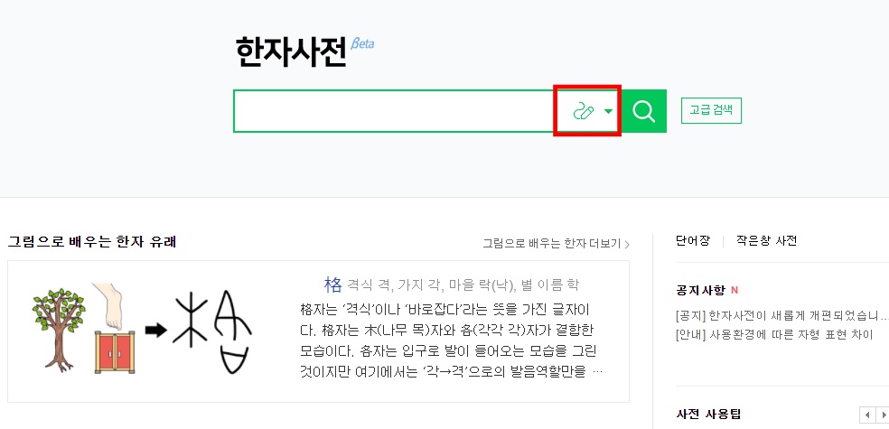 검색란 부분에 연필 버튼을 클릭하면 팝업창으로 한자사전 필기인식기가 바로 뜹니다.