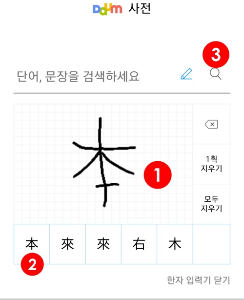 휴대폰에서 네이버 한자사전에 들어가면 맨 왼쪽에 그려서 검색하는 그림을 클릭하면 하단 부분에 필기인식기가 생성됩니다.
