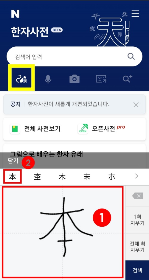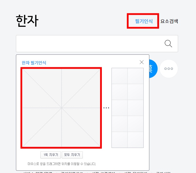 다음 한자사전에 들어가면 검색 칸 위에 필기인식을 클릭하면 한자를 그려 필기인식을 통해 한자를 찾을 수 있습니다.