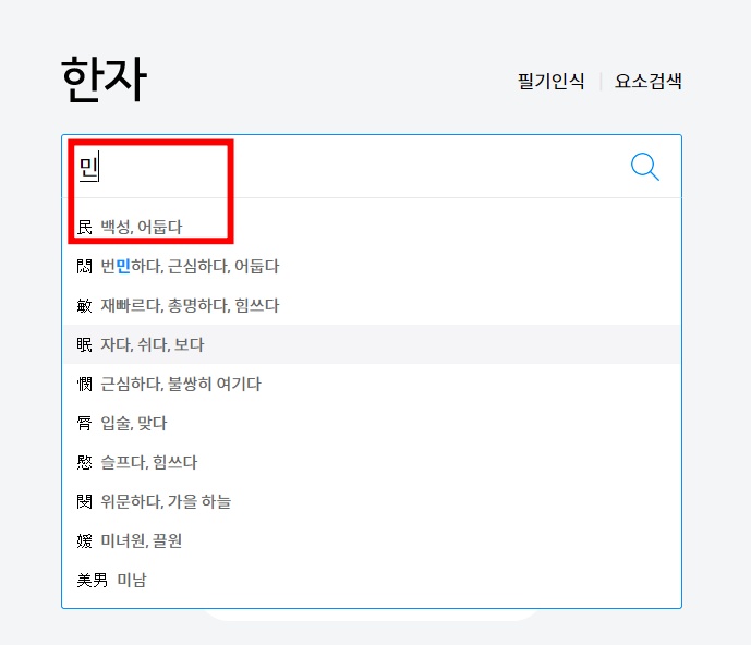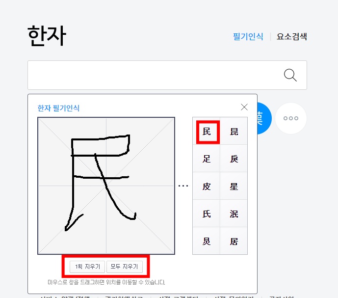 저는 백성 민 한자가 형태만 생각나서 이 한자를 그려봤는데 한자사전 필기인식 옆으로 그린 한자와 비슷한 유사 한자들이 바로바로 나열되는 점이 좋았습니다.