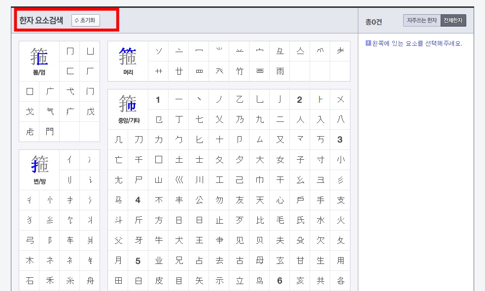 다음 한자사전 필기인식 외에도 음을 알고 있으면 음을 통해 찾으실 수 있으며, 옥편처럼 한자 요소를 통해 한자사전을 활용하실 수도 있습니다.