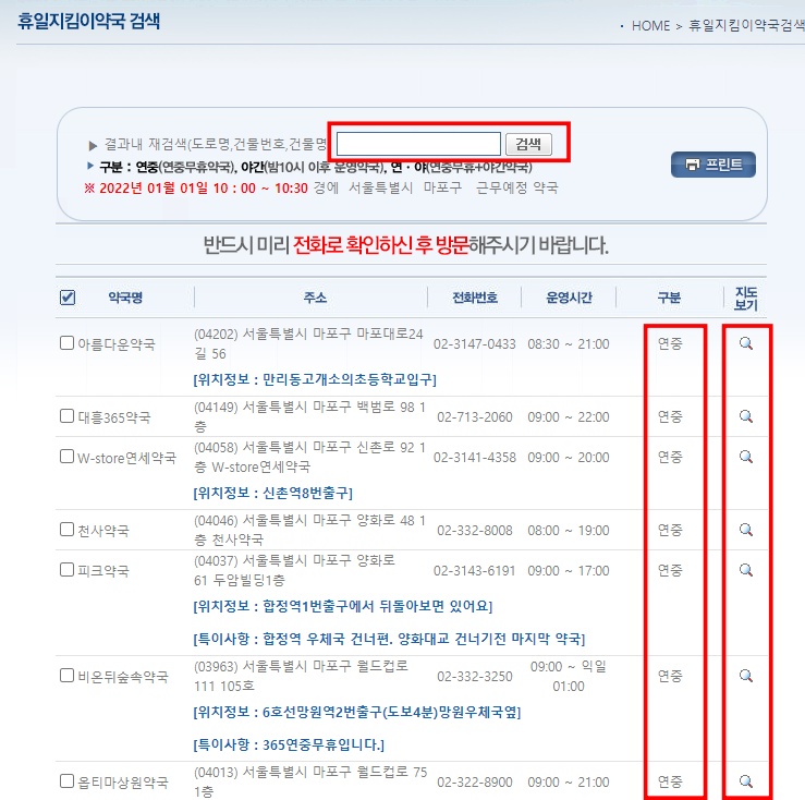 휴일지킴이 약국 리스트가 검색되면 주소와 전화번호, 운영시간이 나오고 구분에 연중(연중무휴약국), 야간( 밤 10시 이후 운영약국), 연야( 연중무휴+야간약국)로 구분됩니다. 이 부분을 잘 확인하시면 원할 때에 약국을 쉽게 찾는데 도움이 됩니다.
