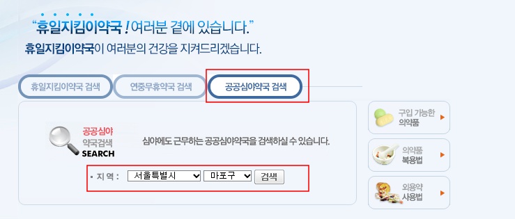 대한약사회에서 운영하는 사이트로 이 시스템은 휴일지킴이 약국 뿐 아니라 공공심야약국, 연중무휴약국을 포함하여 일반적인 약국 영업시간외에 긴급상황에 있을 때 갈 수 있는 약국 정보를 제공합니다.