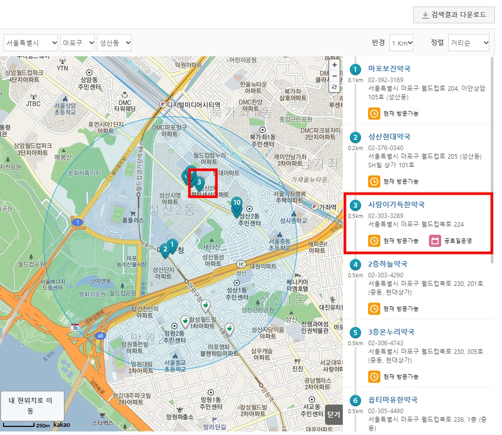 주소에서 시와 구, 그리고 동을 입력하면 지도가 검색되며 오른쪽으로 해당 지역의 약국 리스트가 나옵니다.