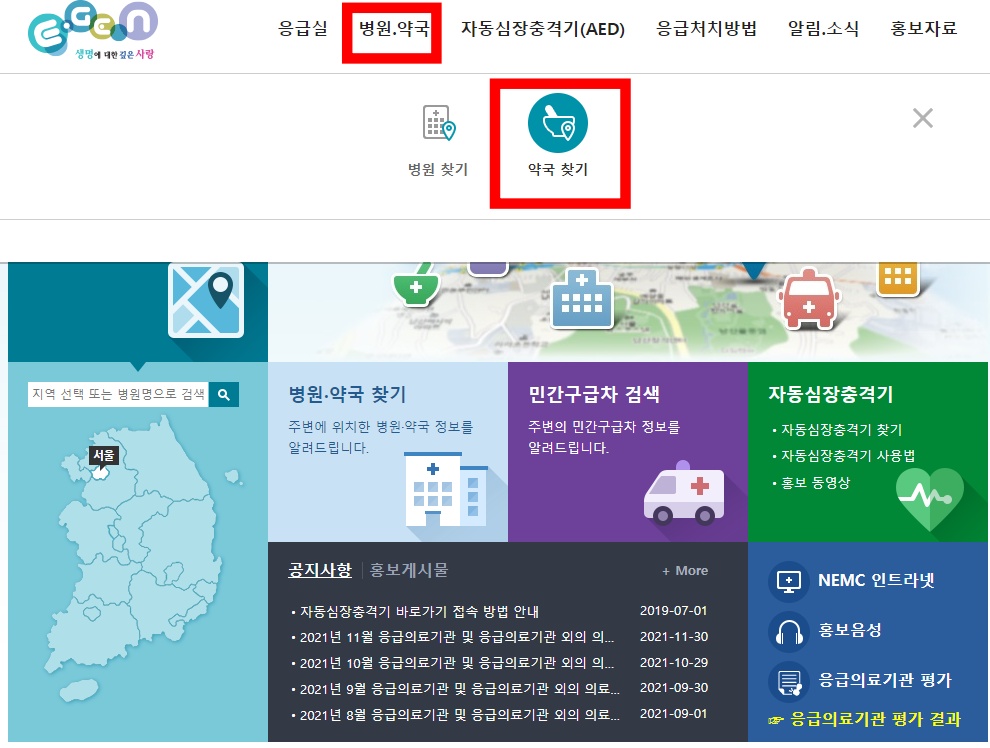 응급의료포털 e-gen 사이트는 약국 뿐 아니라 병원 찾기도 가능합니다.