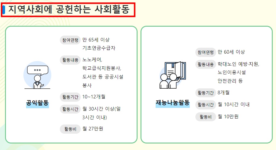 공익활동의 참여자격은 만 65세 이상의 기초연금수급자면 가능하며 노노케어, 학교급식지원 봉사 등 공공시설 봉사가 주된 활동으로 활동기간은 10~12개월 정도이며 월 30시간 이상 ( 일 3시간 이내)이며 그에 따른 활동비는 월 27만 원입니다.