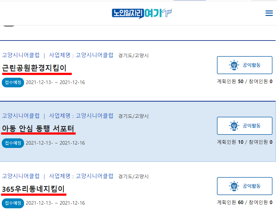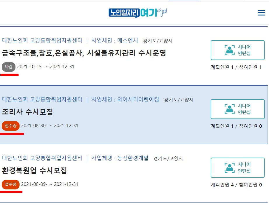 관악구에는 마감된게 많아서 고양시로 다시 검색하였는데 노인일자리 여기 홈페이지에서는 다양한 일자리가 검색되었습니다.