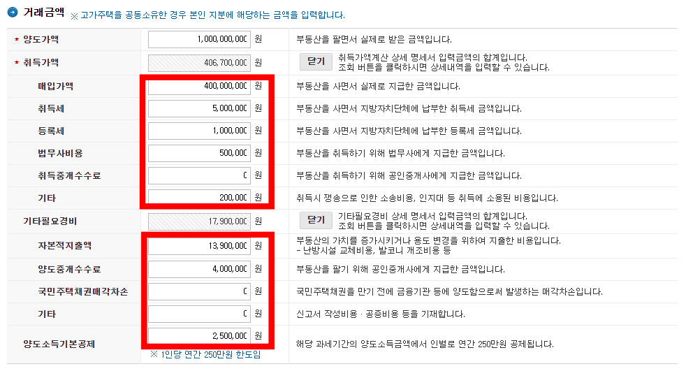 - 양도소득세 거래 세부 금액을 입력 합니다.