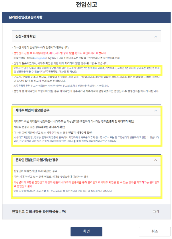 2. 전입신고 인터넷 신청시 유의사항 확인하기