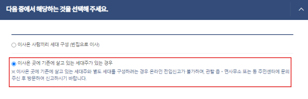 이사온 곳에 기존에 살고 있는 세대주가 있는 경우 선택합니다.