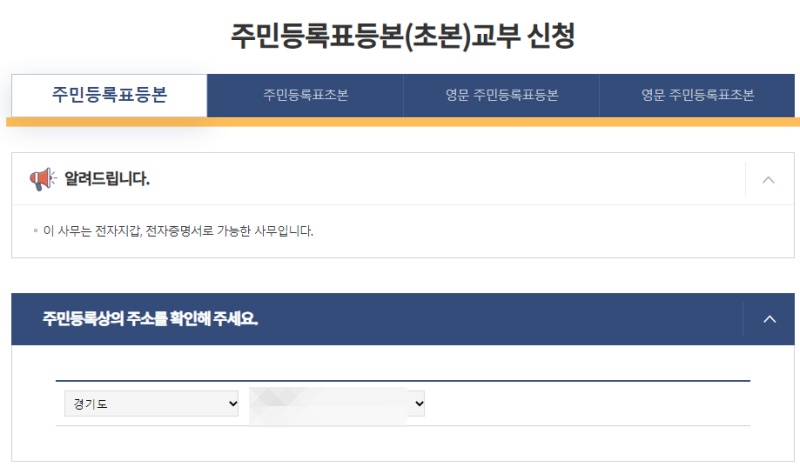 이 페이지에서 주민등록등본 / 초본 / 영문 주민등록등본 / 영문 초본에서 원하시는 발급 형태를 출력할 수 있으며, 현재 주민등록상 거주지가 맞는지 확인합니다.