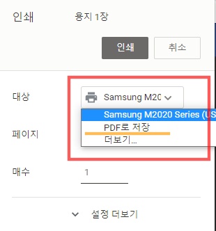 인쇄대상을 프린터 아래에 PDF로 저장을 누르시면 PDF 파일로 저장되며, 출력이 가능할 때 출력하시면 됩니다.