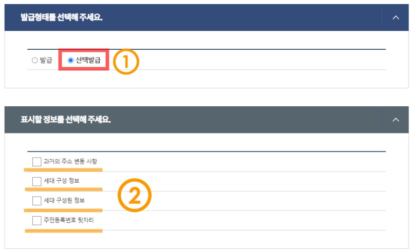 선택발급을 하고 싶다면 하단의 그림에서 오른쪽에 있는 선택 발급을 누르면 출력할 정보를 선택할 수 있습니다.
