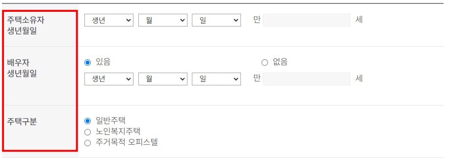 주택 소유자와 배우자가 있다면 배우자의 생년월일을 입력하고, 주택 형태를 입력합니다.