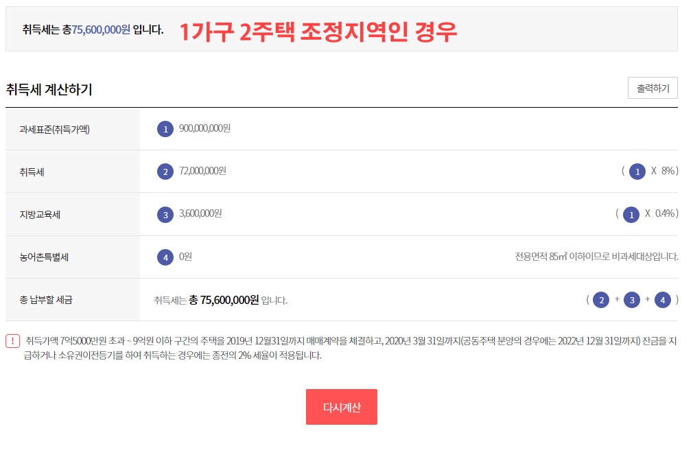 1가구1주택인 경우에 추가로 신규주택을 매입할 경우, 위의 첫 번째의 조건 즉, 조정지역 내 84m2의 주택을 9억 원에 매입한다면 이러한 경우 취득세는 7560만 원이 나오게 됩니다.