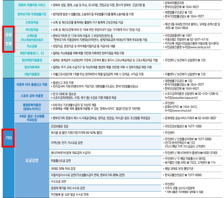 양육비 지원과 여러 선정기준 이하인 경우 의료비 , 주거비, 교육비 등 맞춤형 기초생활이 보장되며 유치원 학비 지원 아이 돌봄 서비스 , 가사 간병 방문 지원 및 초등 돌봄 교실 등 주민센터나 보건소, 누리집 등 관할 기관에 필요하신 경우 꼭 신청하여 받아보시면 좋겠습니다.
