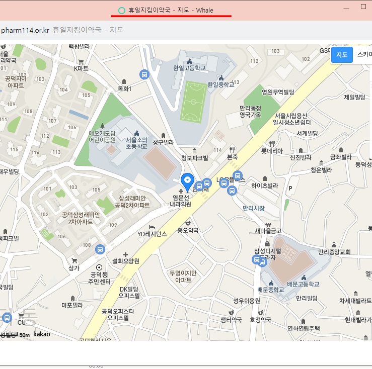 주소에서 시와 구, 그리고 동을 입력하면 지도가 검색되며 오른쪽으로 해당 지역의 약국 리스트가 나옵니다.