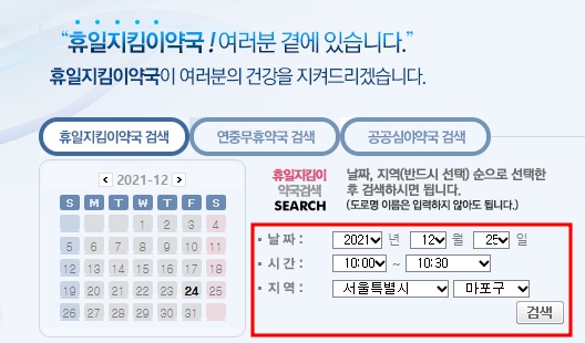 휴일지킴이 약국 사이트에서는 원하는 날짜 및 시간과 지역을 검색하시면 약국리스트가 나옵니다.